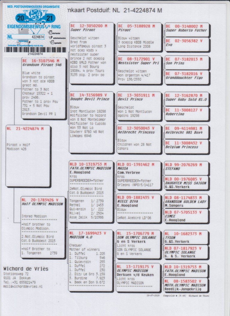 Uit: ”Grandson Piraat 546”, uit dochter ”Devil Prince”, 1. Nat. Montlucon 19.298 d. x ”Half Olympic Madison”, 1/2 zus ”Olympic Madison”, 2. Olympiade duif, moeder 1. Prov. 12.649 d., 1. Prov. 7.778 d., 1. NPO 2.404 d.