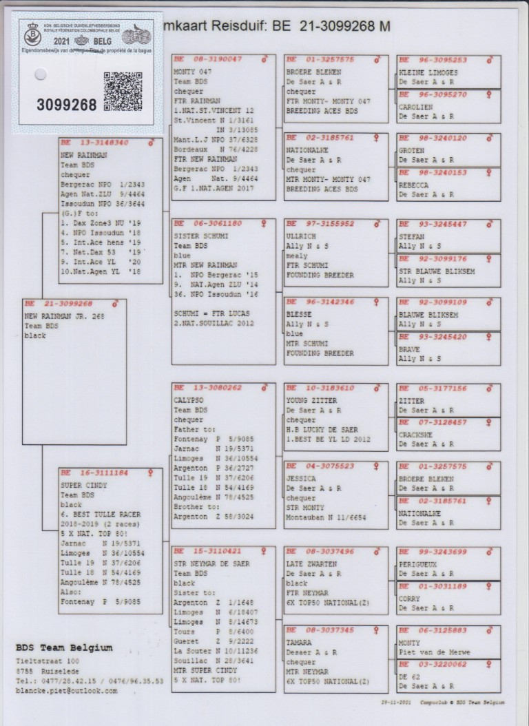 Uit: ”New Rainman”, 1. NPO Bergerac 2.343 d., 9. Nat. Agen ZLU 4.464 d., vader & gr-vader 1. NU Dax, 4. NPO Issoudun, 5. Int. Asduif Duivinnen, 7. Nat. Dax x ”Super Cindy”, 6. Nat. Asduif Tulle, 19.-36.-37.-54.-78. Nat. KBDB