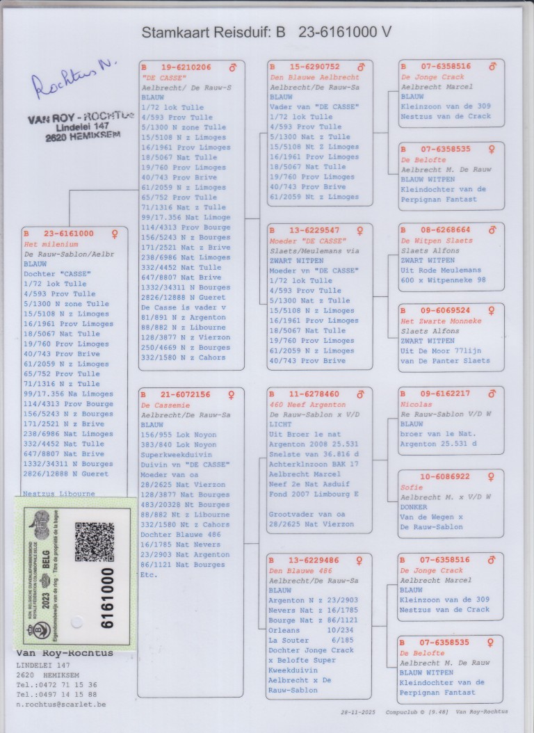 Grootvader: B11-6278460. ‘460 Neef ‘Argenton’, De Rauw-Sablon’, v.d. Wegen.