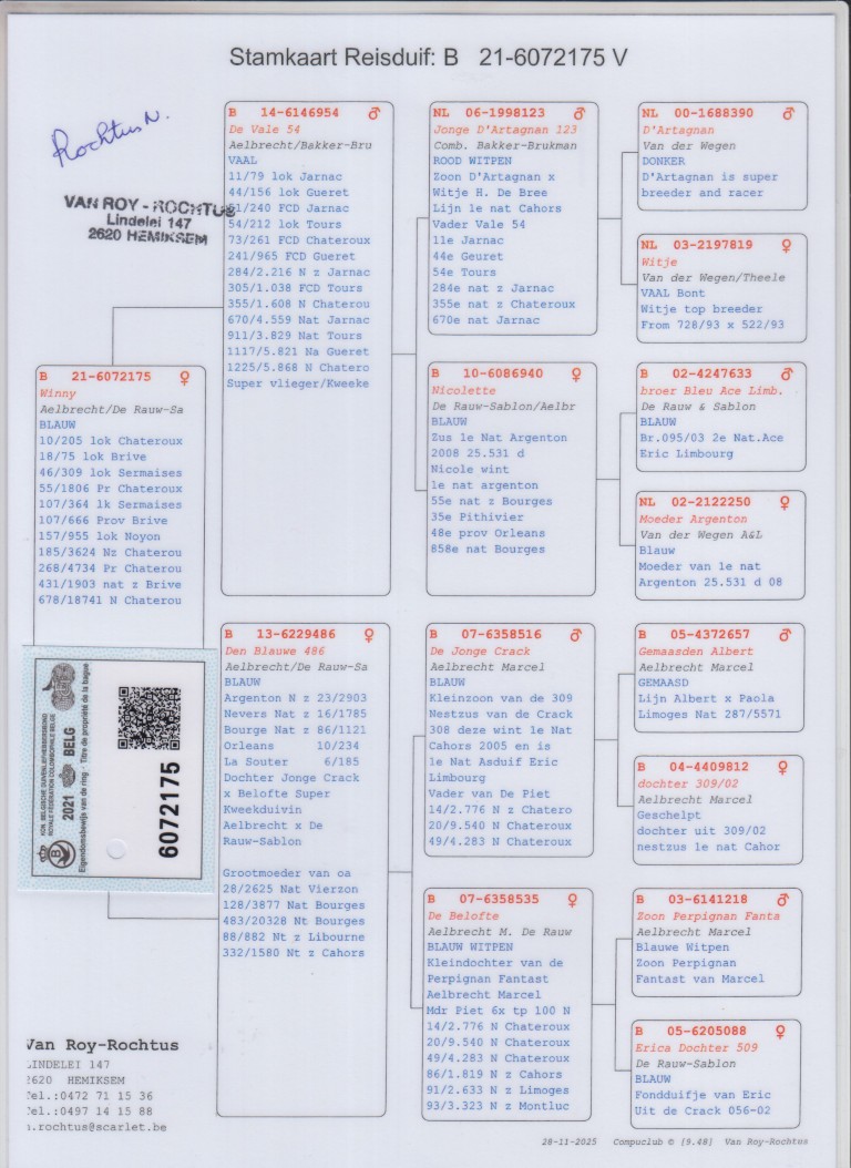 Dochter ‘Jonge Crack’ x ‘Belofte Super Kweekduivin’, Aelbrecht x De Rauw-Sablon.