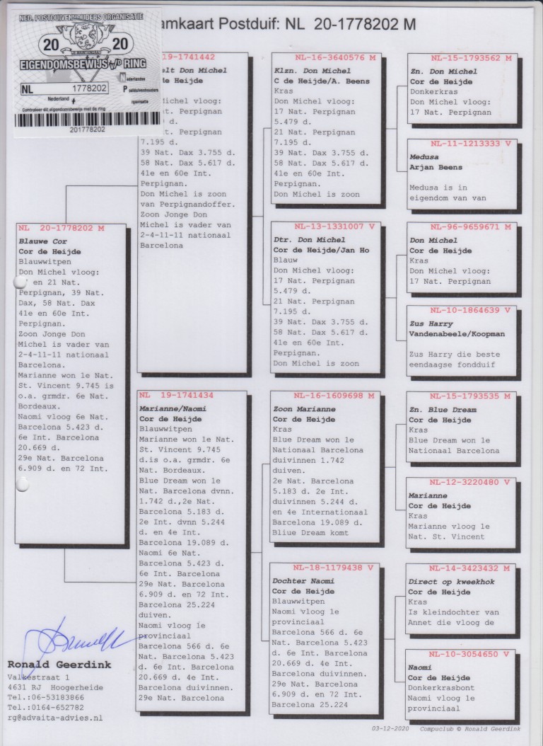 Uit: ”Inteelt Don Michel”, uit klz. & dochter ”Don Michel”, Unieke stamvader Cor de Heijde x ”Marianne / Naomi”, uit dochter ”Naomi”, 1. Int. Asduif Barcelona, uit zoon ”Marianne”, 1. Nat. St.Vincent, uit klz. ”Blue Dream”