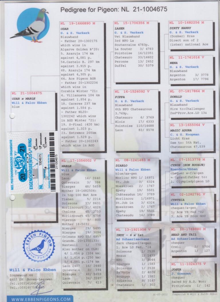 Uit: ”Odar”, vader 1. Prov. 7.291 d., 1.-2.759 d., 1.-2.567 d., 1.-2.370 d., 1.-2.344 d., 9. Nat. Asduif Jaarlingen x ”Mable”, dochter ”Diablo” & ”Indy”