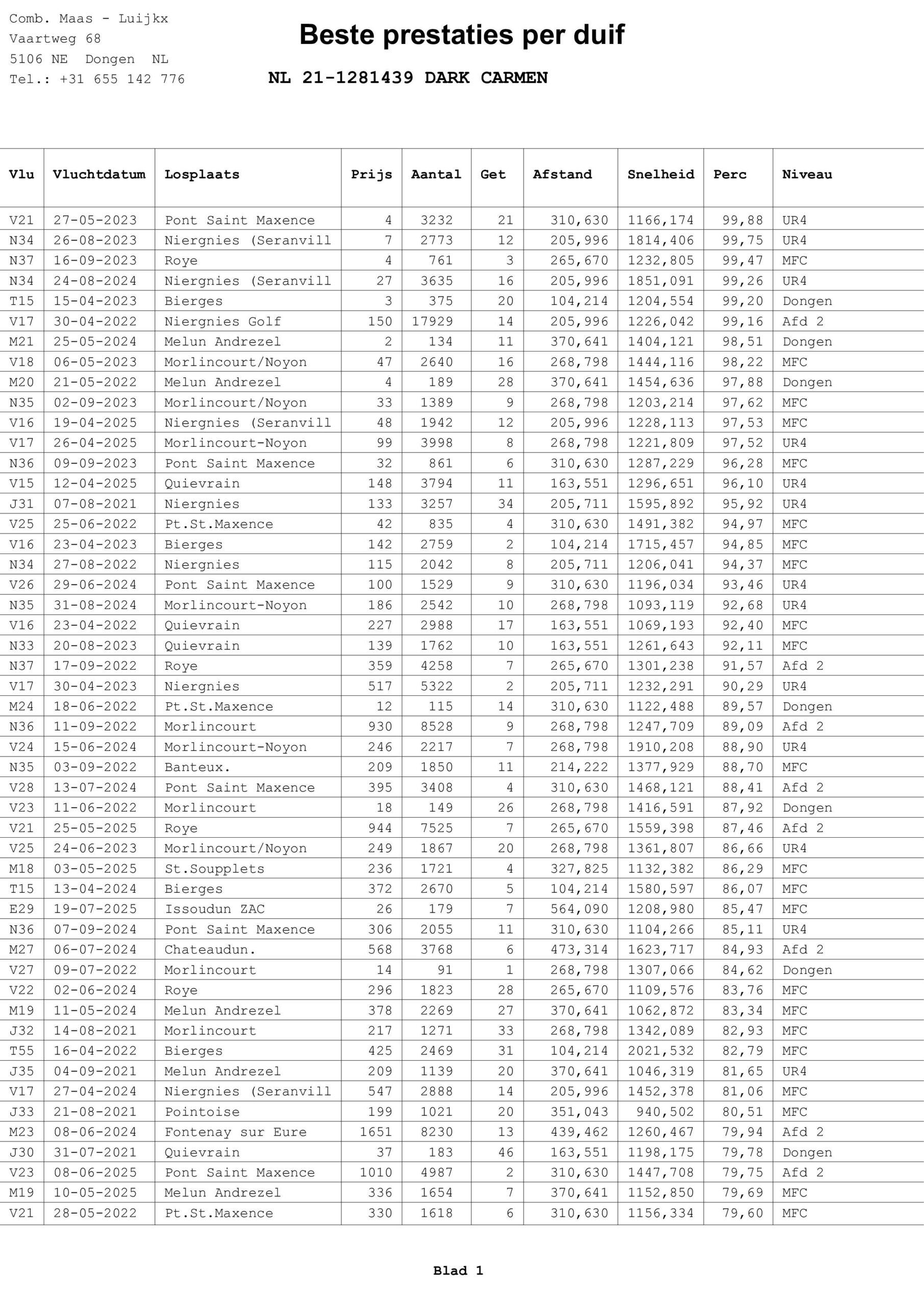 Zelf o.a.: 1. Asduif Natour Federatie MFC 2023, 2.-134 d., 3.-375 d., 4.-3.232 d., 4.-761 d., 4.-189 d., 7.-2.773 d., 27.-3.635 d., 33.-1.389 d., 47.-2.640 d., 48.-1.942 d., 99.-3.998 d., etc.