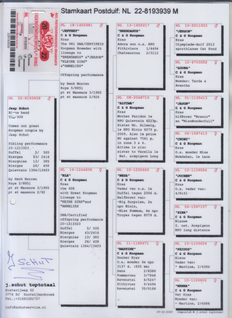 Uit: ”Jeffrey”, uit zoon ”Jerson”, Olympiade duif Cat. Dagfond 2013, uit zoon ”Adora”, 1. NPO Pithiviers 4.494 d., 2. NPO Chateauroux 3.112 d. x ”Ela”, uit zoon ”Zina”, 2. Nat. Asduif Dagfond NPO, gr-moeder ”Coby”, 1. Nat. Asduif Dagfond PIPA-Rankings
