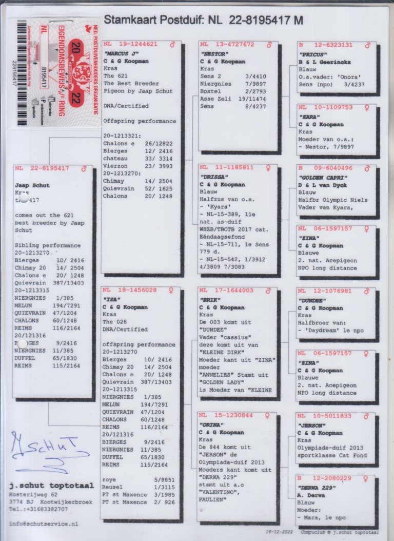 Grootvader: NL13-4727672. ‘Nestor’, C. & G. Koopman.