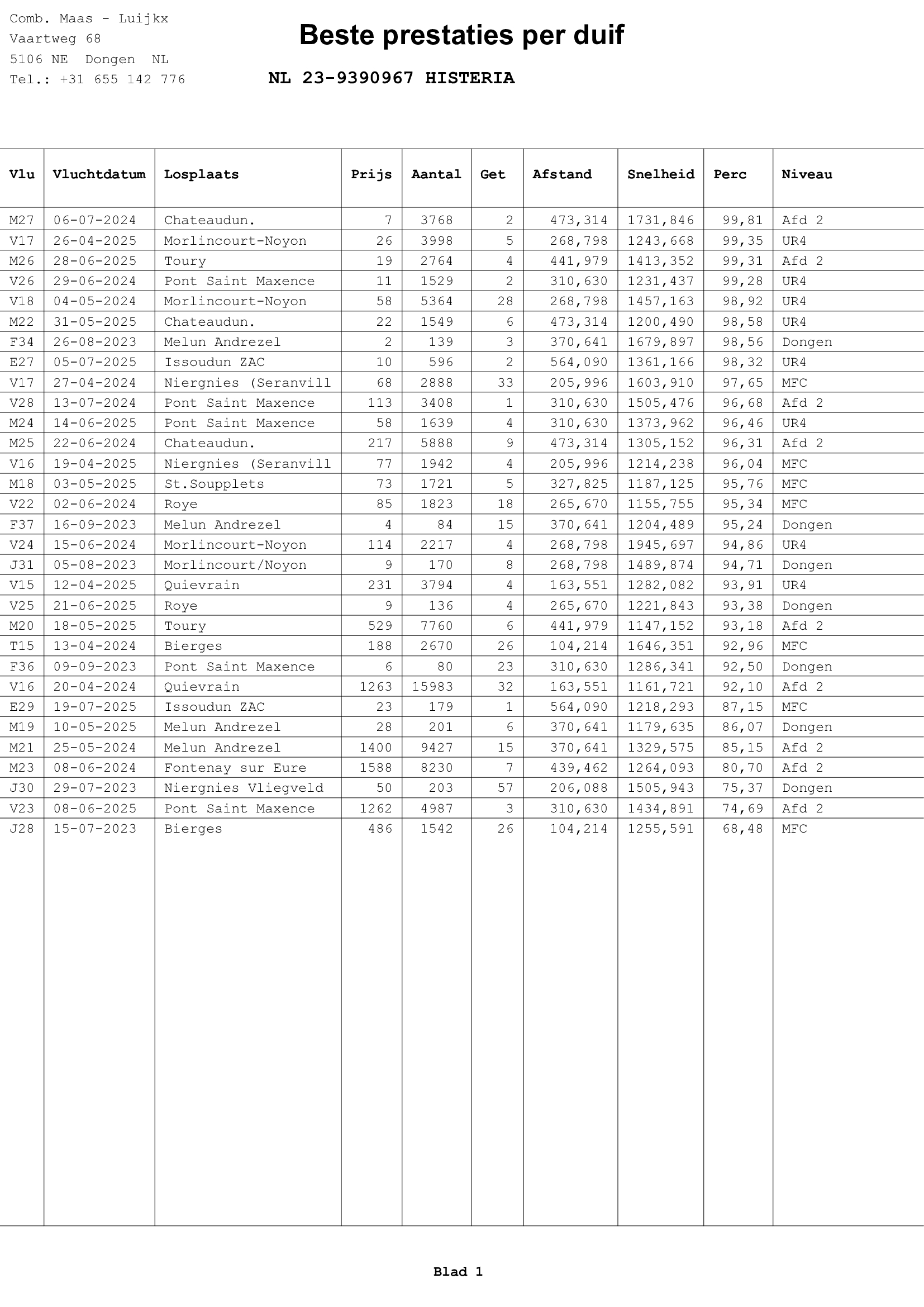 Zelf o.a.: 2. Asduif Midfond Rayon 2025, 2. Asduif Vitesse Rayon 2024, 2.-139 d., 7. NPO Chateaudun 3.768 d., 11.-1.529 d., 19. NPO Toury 2.764 d., 22.-1.549 d.