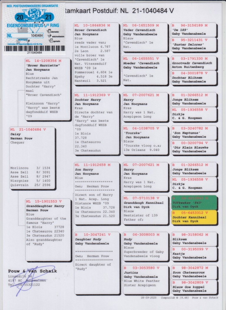 Uit: ”Broer Harriette”, uit dochter ”Harry”, 1. Nat. Asduif x ”Grdtr. Harry”, uit zoon legendarische ”Harry”, uit dochter ”Rudy”, Gaby Vandenabeele