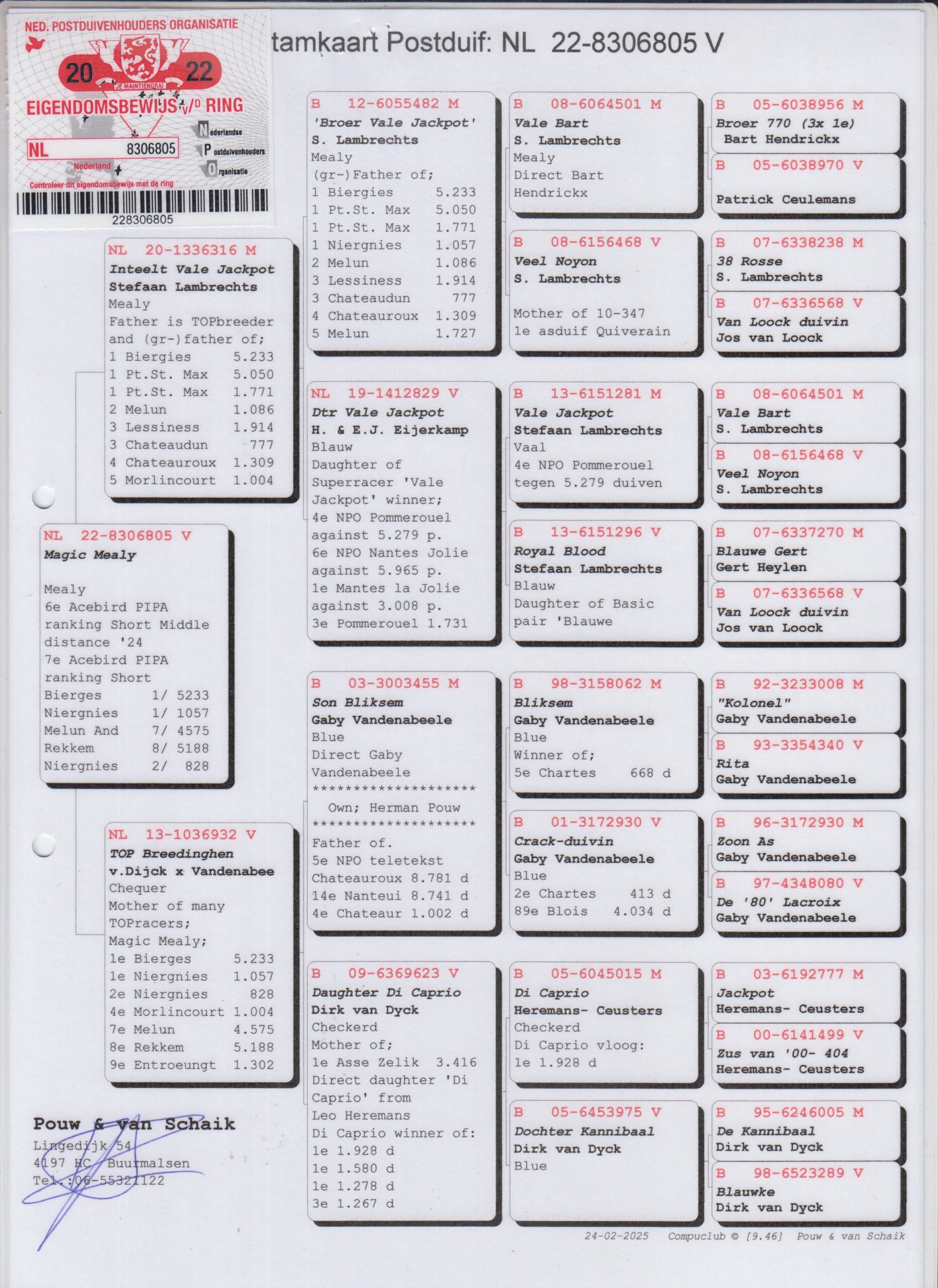 Grootvader: B12-6055482. Broer ‘Vale Jackpot’, S. Lambrechts.