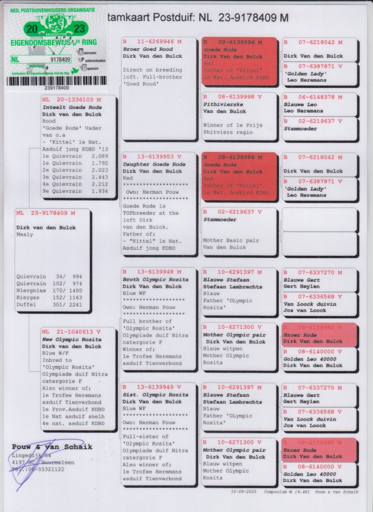 Grootvader: B13-6139948. Broer ‘Olympic Rosita’, Dirk van den Bulck.