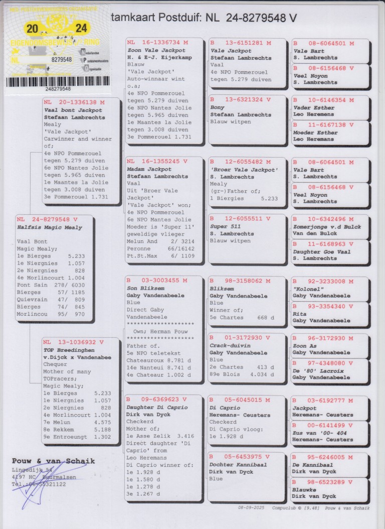 ”Half sister Magic Mealy”, 1/2 zus ”Magic Mealy”, 6. Nat. Asduif Vitesse & Midfond, 7. Nat. Asduif Vitesse PIPA, 11. Nat. Asduif NPO, 1.-5.233 d., 1.-1.057 d.