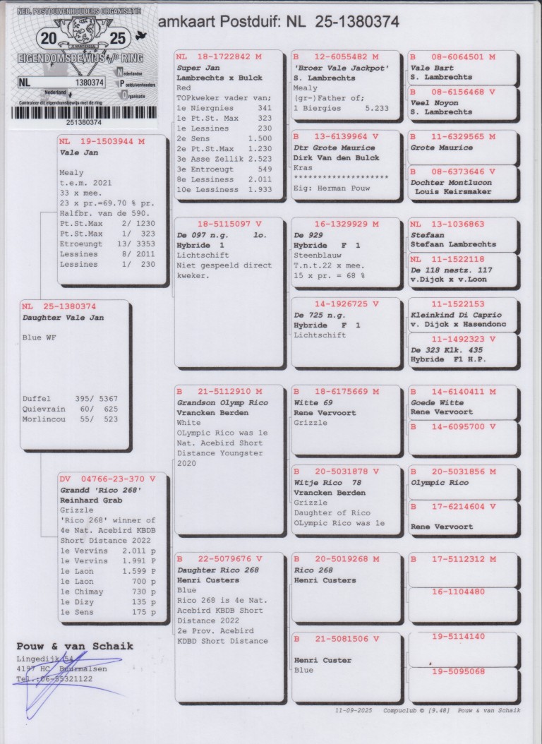 Grootvader: B21-5112910. Kleinzoon ‘Olympic Rico’, Vrancken Berden.