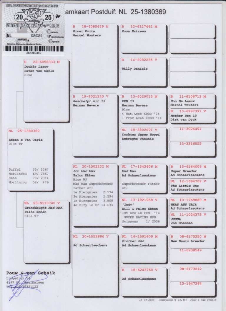 Uit: ”Double Leeuw”, uit dochter ”Den 13”, 4. Nat. Asduif KBDB x ”Grandd Mad Max”, 1/2 zus 1.-3.808 d., 1.-2.594 d.