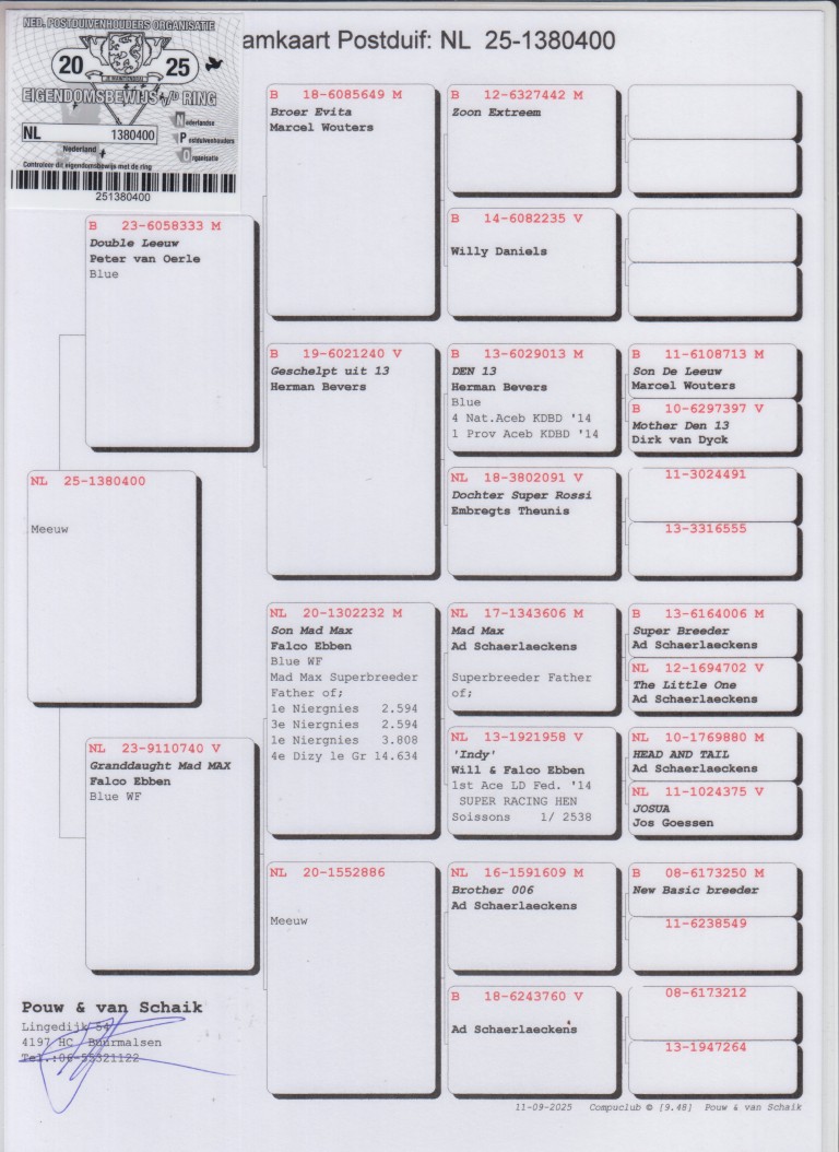 Uit: ”Double Leeuw”, uit dochter ”Den 13”, 4. Nat. Asduif KBDB, uit broer ”Evita” x ”Grandd Mad Max”, 1/2 zus 1.-3.808 d., 1.-2.594 d., uit zoon ”Indy”, 1. Asduif Dagfond Federatie, 1. Soissons 2.538 d.