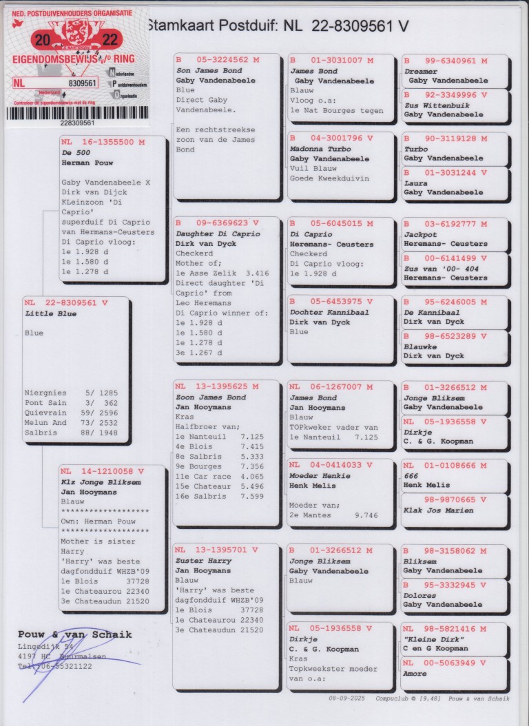 Uit: ”De 500”, uit 1/2 zus ”Olympic Niels”, 3. Olympiade duif x ”Kld. Jonge Bliksem”, uit zus ”Harry”, 1. Nat. Asduif