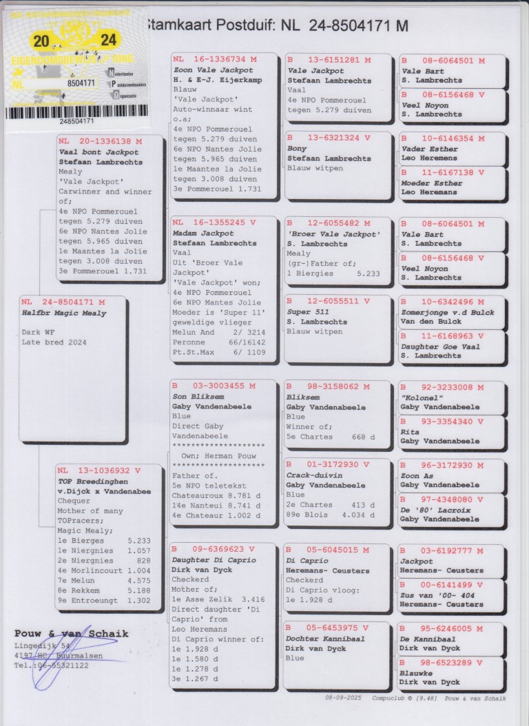 ”Half brother Magic Mealy”, 1/2 broer ”Magic Mealy”, 6. Nat. Asduif Vitesse & Midfond, 7. Nat. Asduif Vitesse PIPA, 11. Nat. Asduif NPO, 1.-5.233 d., 1.-1.057 d.