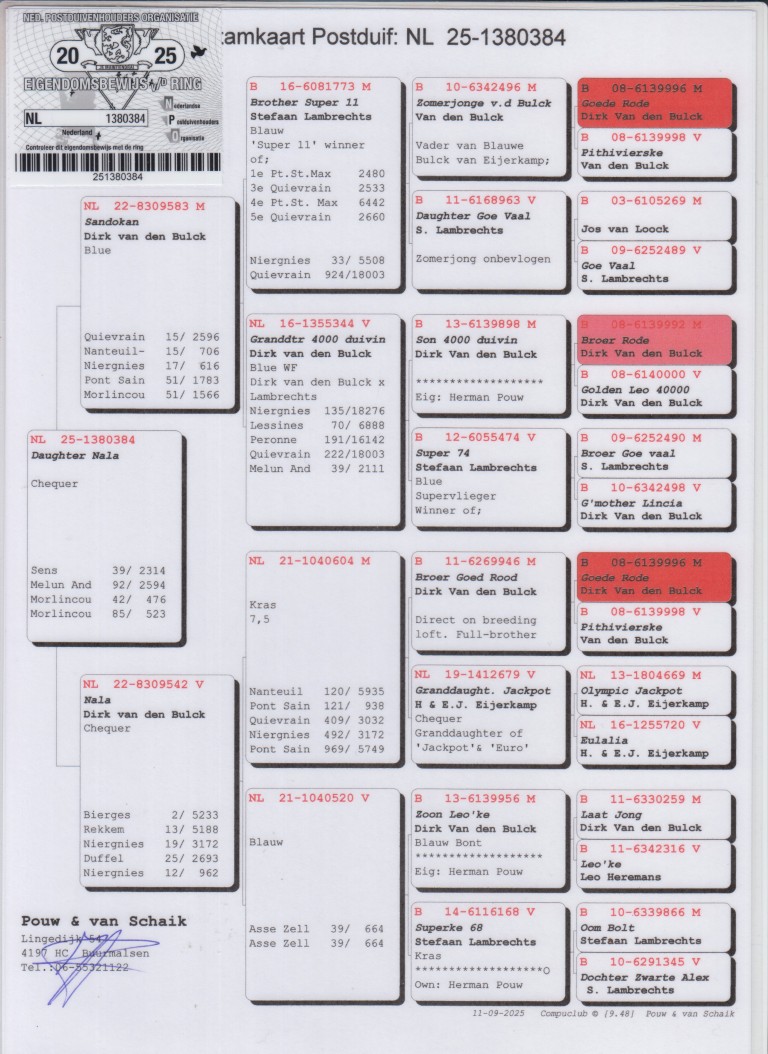 Grootmoeder: NL16-1355344. Kleindochter ‘4000 Duivin’, Dirk van den Bulck.