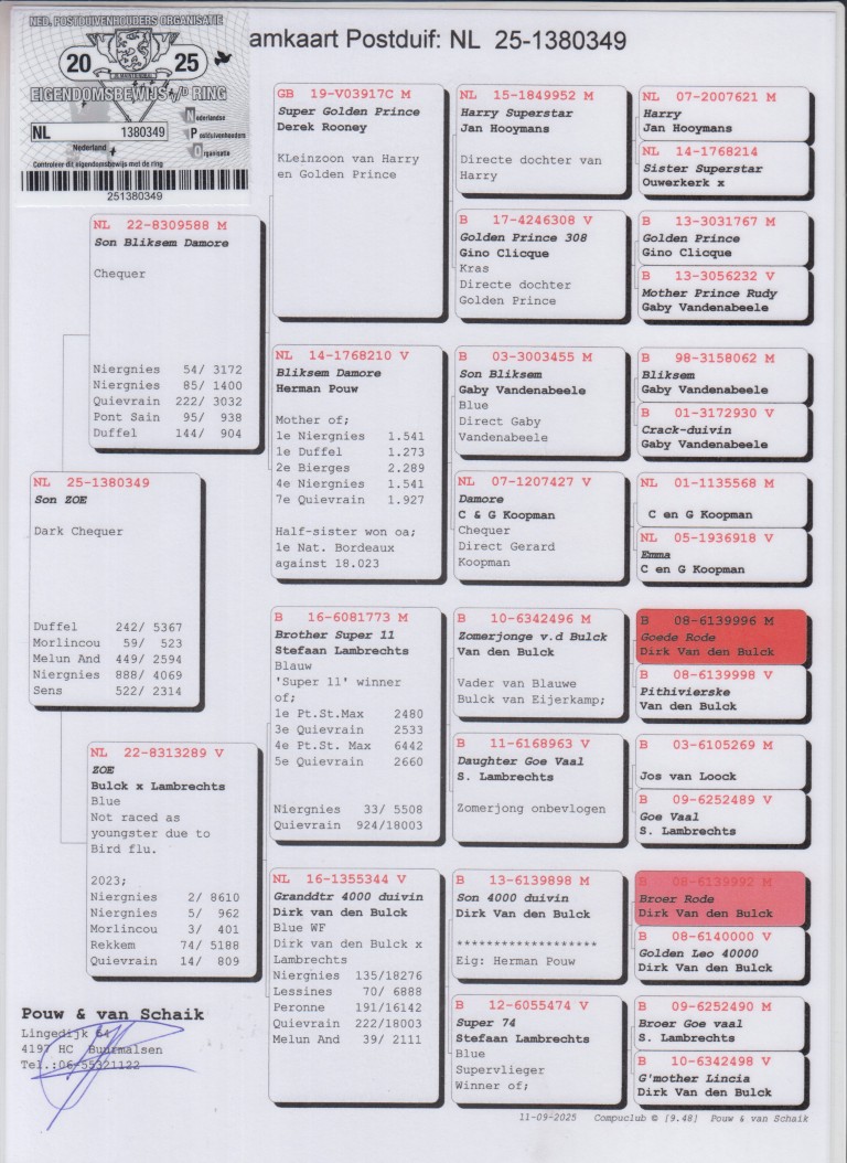 Grootmoeder: NL16-1355344. Kleindochter ‘4000 duivin’, Dirk van den Bulck.