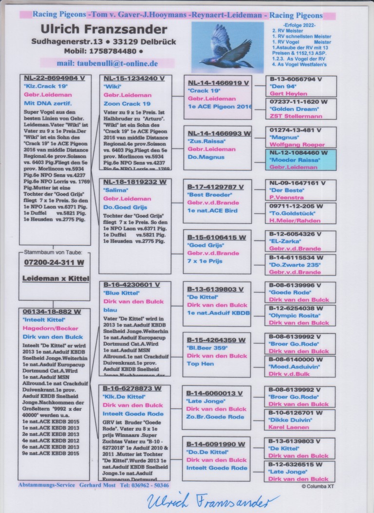 Uit: ”Klz. Crack 19”, Gebr. A. & B. Leideman, uit zoon ”Crack 19”, (Gr) vader ”Arturo”, ”Fabio”, ”Cobalt”, ”Wonder van Goed Grijs”, etc. x ”Inteelt Kittel”, uit zoon ”Kittel”, 1. Nat. Asduif Sprint KBDB & legendarische kweker