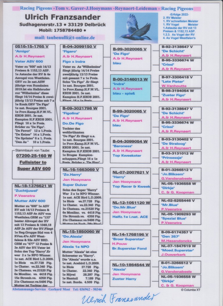 Zus ”De 600”, 1. Regionaal Asduif, 1/2 zus kweker 1. Regionaal Asduif, 2. Nat. Asduif Jaarlingen, 2. Regionaal Asduif, 3. Regionaal Asduif, uit: ”Amigo”, A. & H. Reynaert x ”Zuchtjuwel”, P. Veenstra, uit zoon ”Harry”