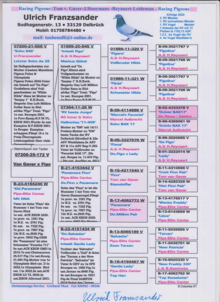 Uit: ”Sohn 845”, inteelt ”Figo”, A. & H. Reynaert x ”Kld. Panamera”, uit zoon ”Finn”, Unieke Stamvader Tom van Gaver, (Gr) vader 1.-3.-4.-7.-7.-11.-11.-13.-15.-etc. Nat. Asduif KBDB, 1. Finale OLR Victoria Falls