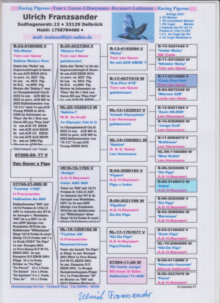 Uit: ”Klz. Ricky”, Tom van Gaver, uit zoon ”Ricky” & ”Zus Finn 418”, zoon ”Sabine I”, 1. Olympiade duif, 1. Nat. Asduif KBDB x ”Tochter 1765”, 1/2 zus 1. & 4. Regionaal Asduif, inteelt ”Figo”, A. & H. Reynaert