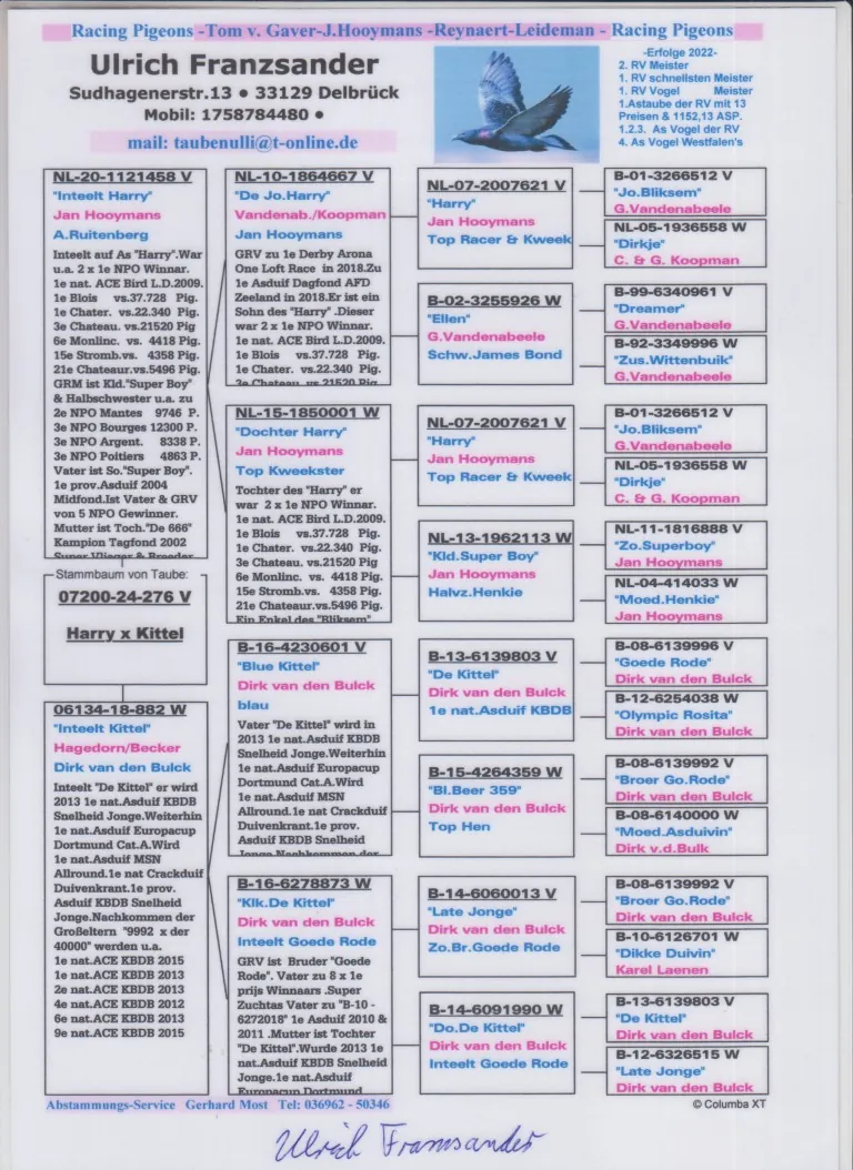 Uit: ”Inteelt Harry”, Jan Hooymans, uit zoon & dochter ”Harry”, 1. Nat. Asduif Dagfond WHZB & Legendarische kweker x ”Inteelt Kittel”, Dirk van den Bulck, uit zoon ”Kittel”, 1. Nat. Asduif Sprint KBDB & Legendarische kweker