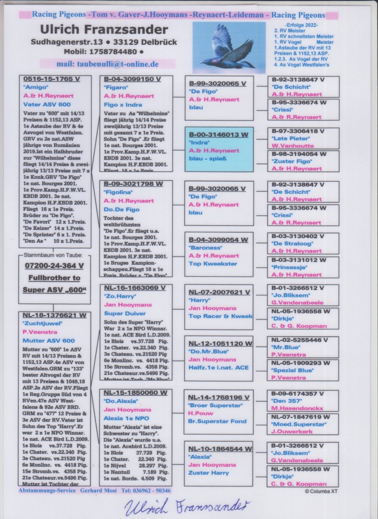 Broer ”De 600”, 1. Regionaal Asduif, 1/2 zus kweker 1. Regionaal Asduif, 2. Nat. Asduif Jaarlingen, 2. Regionaal Asduif, 3. Regionaal Asduif, uit: ”Amigo”, A. & H. Reynaert x ”Zuchtjuwel”, P. Veenstra, uit zoon ”Harry”