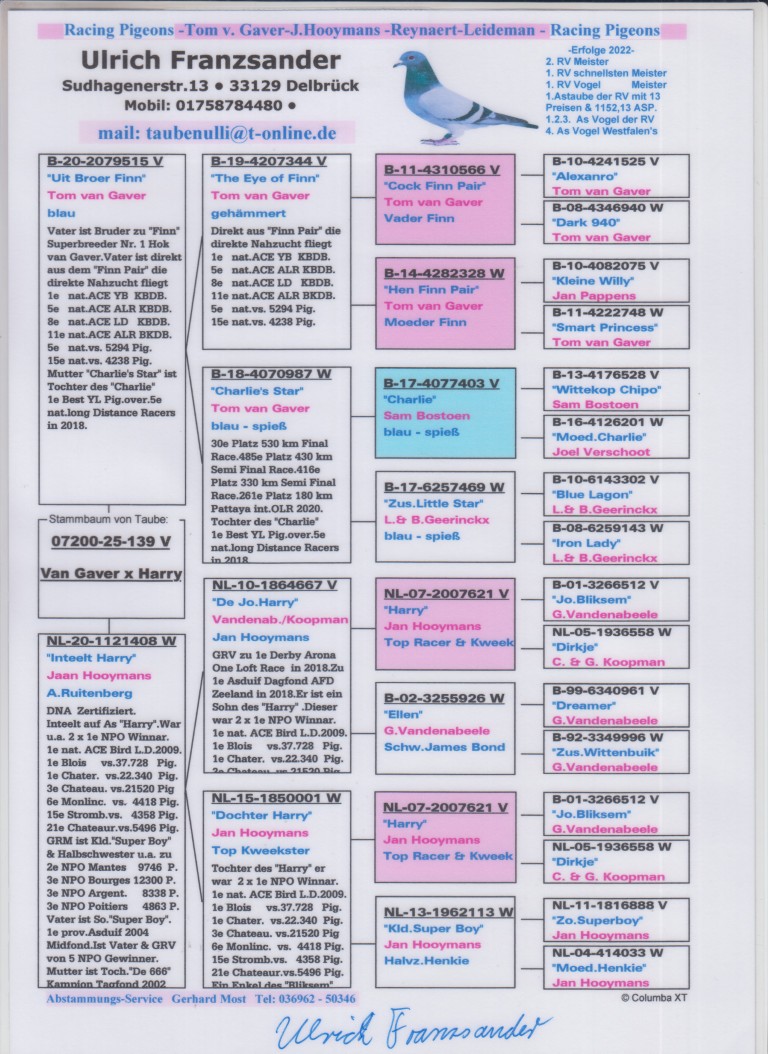 Uit: ”Uit Broer Finn”, Tom van Gaver, uit broer ”Finn”, Unieke Stamvader, nazaten 1. Nat. Asduif KBDB, 1. World Best, 1. Finale OLR Victoria Falls x ”Inteelt Harry”, uit zoon & dochter ”Harry”, 1. Nat. Asduif Dagfond WHZB