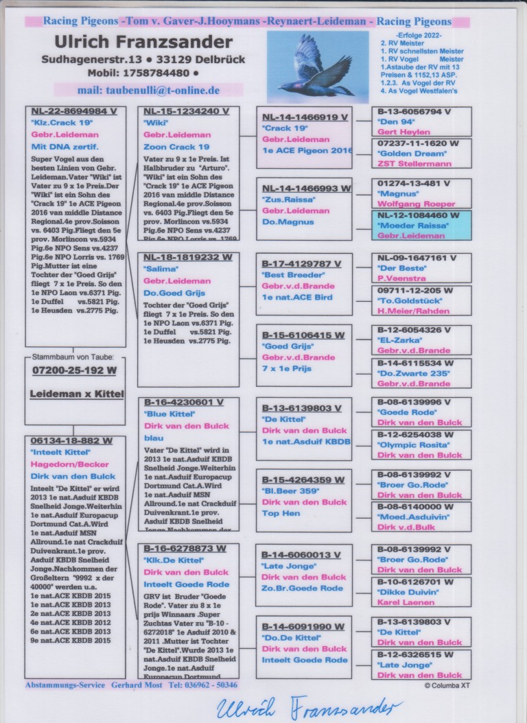 Uit: ”Klz. Crack 19”, Gebr. A. & B. Leideman, uit zoon ”Crack 19”, (Gr) vader ”Arturo”, ”Fabio”, ”Cobalt”, ”Wonder van Goed Grijs”, etc. x ”Inteelt Kittel”, uit zoon ”Kittel”, 1. Nat. Asduif Sprint KBDB & legendarische kweker