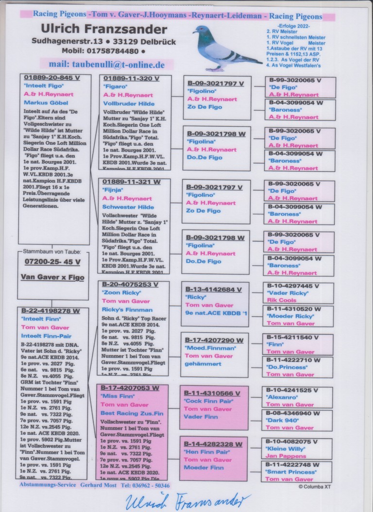 Uit: ”Inteelt Figo”, A. & H. Reynaert, inteelt ”Figo” x ”Inteelt Finn”, Tom van Gaver, uit zoon ”Ricky”, 9. Nat. Asduif KBDB, uit zus ”Finn”, nazaten 1. Nat. Asduif KBDB, 1. Nat. Asduif World Best, 1. Finale OLR Victoria Falls