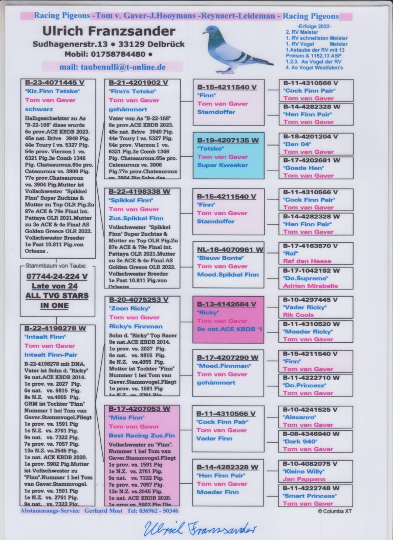 Uit: ”Klz. Finn Tetske”, 1/2 broer 6. Prov. Asduif KBDB, uit zoon ”Finn” & ”Tetske”, uit dochter ”Finn” x ”Inteelt Finn”, uit zus ”Finn”, Unieke stamvader Tom van Gaver, uit zoon ”Ricky”, gr-vader 1. Nat. Asduif Allround KBDB
