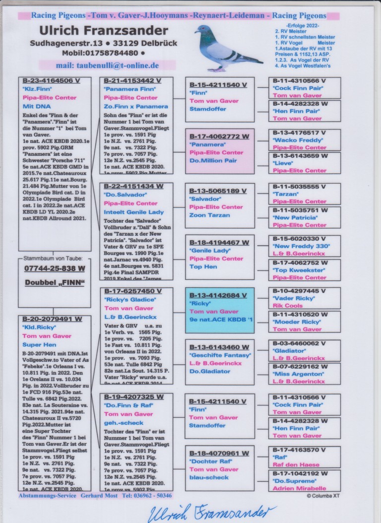 Uit: ”Klz. Finn”, uit zoon ”Finn”, Unieke stamvader, vader & gr-vader 1.-3.-4.-7.-7.-11.-11.-13.-15.-etc. Nat. Asduif KBDB. 1. Finale OLR VF & ”Panamera” x ”Kld. Finn / Ricky”, uit zoon ”Ricky”, uit dochter ”Finn”