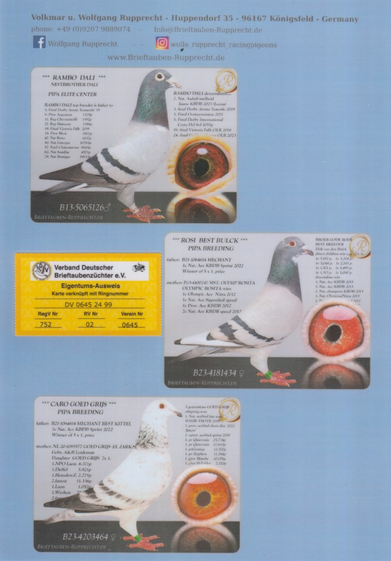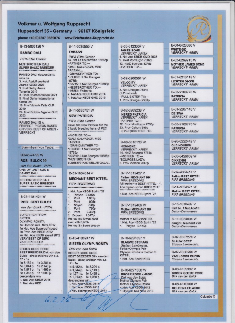 Uit: ”Rambo Dali”, nazaten: 2. Nat. Asduif KBDB, 3. Finale OLR D. Arona, 3. Finale OLR Ostseerennen, 5. Finale OLR Costa x ”Rosi Best Bulck”, dochter ”Méchant Best Kittel”, 1. Nat. Asduif Sprint KBDB, uit zus ”Olympic Rosita”
