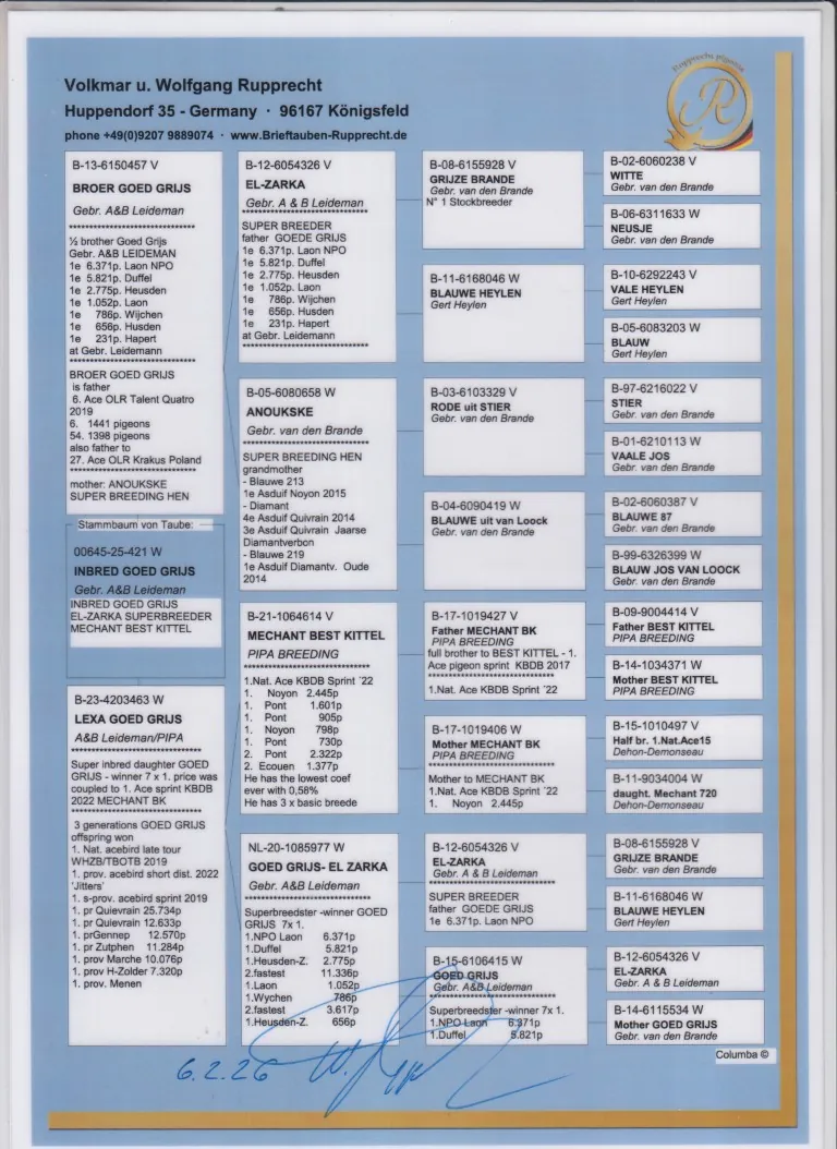 Uit: ”Broer Goed Grijs”, broer ”Goed Grijs”, 7x 1. Prijs & 1. NPO Laon 6.371 d., nazaten winnen 7x 1. Nat. Asduif x ”Lexa Goed Grijs”, dochter ”Méchant Best Kittel”, 1. Nat. Asduif Sprint KBDB, uit inteelt dochter ”Goed Grijs”