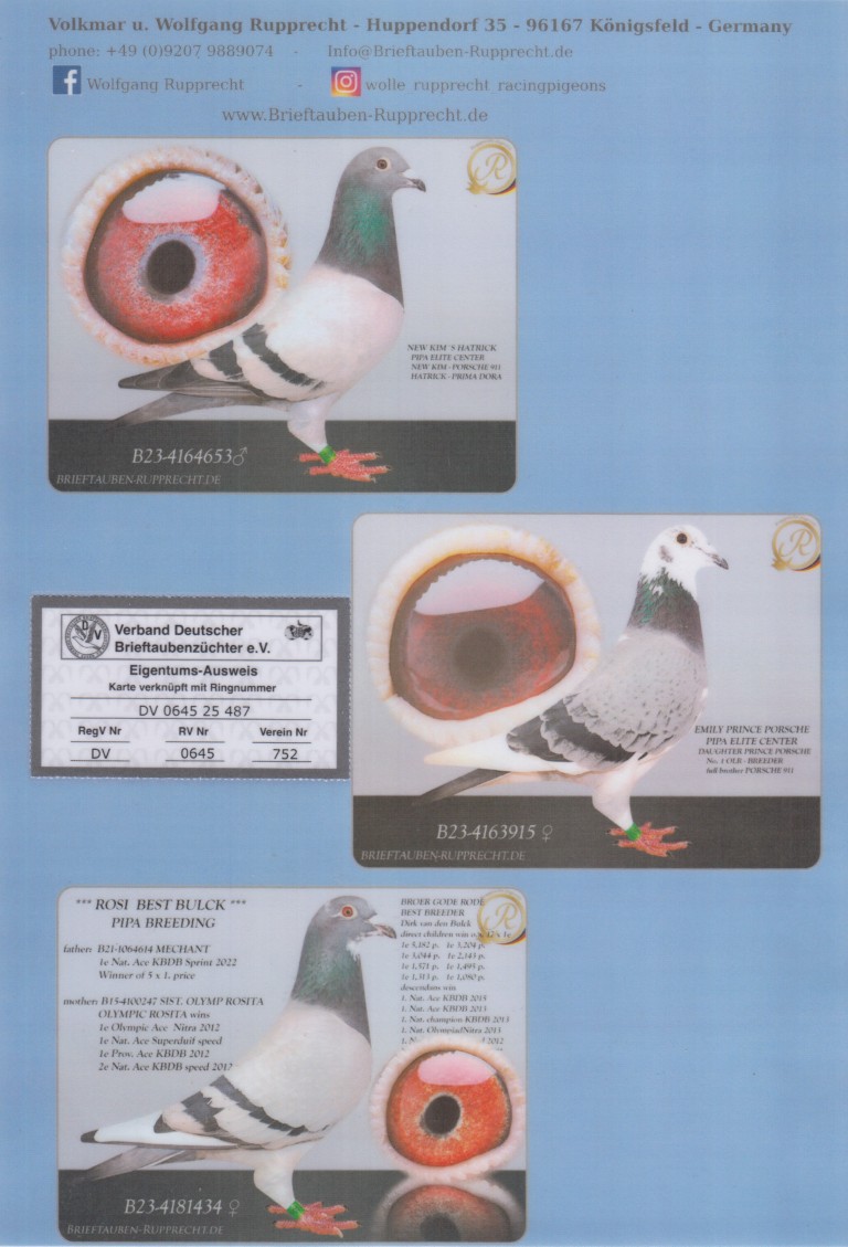 Uit: ”New Kim’s Hattrick”, uit dochter ”Porsche 911” & ”New Kim”, 1. Nat. Asduif KBDB, uit zoon ”Hattrick” & ”Prima Dora”, beide 1. Nat. Bourges x ”Emily Prince Porsche”, dochter ”Prince Porsche”, OLR Wonderkweker