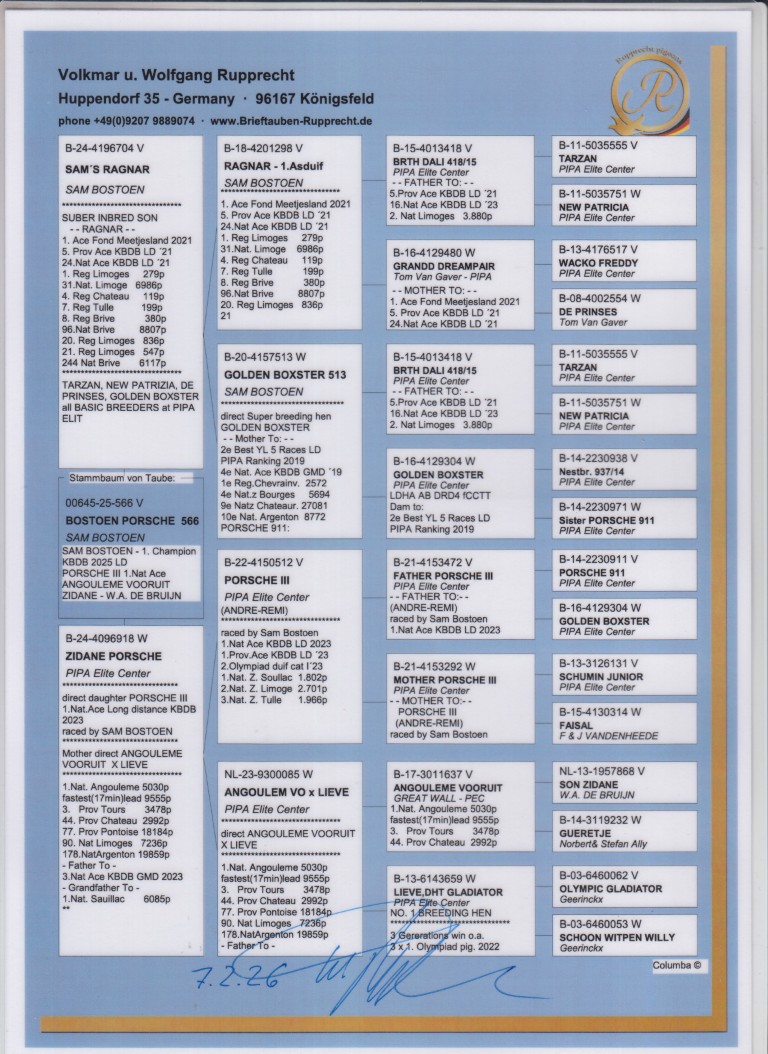 Uit: ”Sam’s Ragnar”, zoon ”Ragnar”, 1. Asduif Fond & 5. Prov. Asduif, 31. Nat. Limoges 6.986 d., uit dochter ”Golden Boxter” x ”Zidane Porsche”, dochter ”Porsche III”, 1. Nat. Asduif Fond KBDB, uit dochter ”Angeloume Vooruit”
