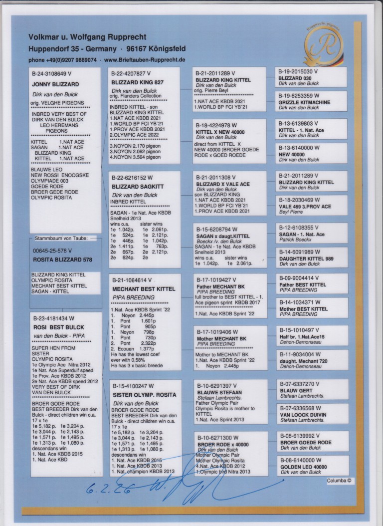 Uit: ”Jonny Blizzard”, uit zoon & kld. ”Blizzard King Kittel”, 1. Nat. Asduif Sprint KBDB & vader ”Unicum”, 1. Nat. Asduif Sprint KBDB 2025 x ”Rosi Best Bulck”, dochter ”Méchant Best Kittel”, 1. Nat. Asduif Sprint KBDB