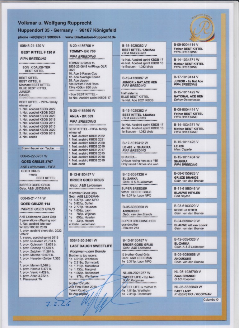 Uit: ”Best Kittel 120”, uit zoon & dochter ”Best Kittel”, 1. & 4. Nat. Asduif Sprint KBDB x ”Goed Grijze 114”, uit broer ”Goed Grijs”, 7x 1. Prijs & 1. NPO Laon 6.371 d., nazaten winnen 7x 1. Nat. Asduif, uit dochter ”Broer Goed Grijs”