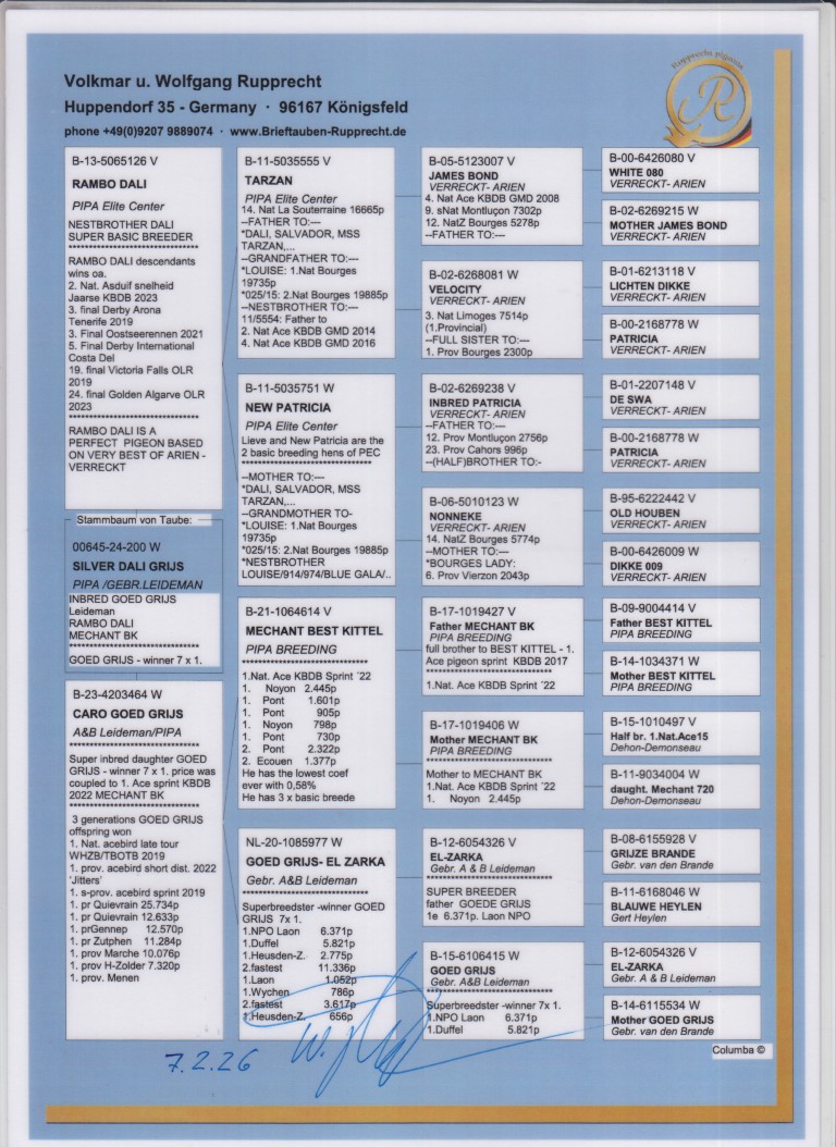 Uit: ”Rambo Dali”, nazaten: 2. Nat. Asduif KBDB, 3. Finale OLR D. Arona, 3. Finale OLR Ostseerennen, 5. Finale OLR Costa x ”Caro Goed Grijs”, dtr. ”Méchant Best Kittel”, 1. Nat. Asduif KBDB & gr-vader 1. Extra Finale PIPR