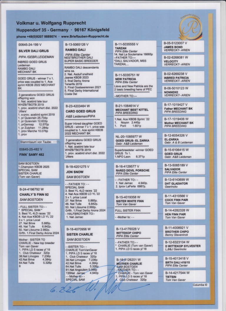 Uit: ”Silver Dali Grijs”, uit dochter ”Goed Grijs”, 7x 1. Prijs & 1. NPO Laon 6.371 d. & ”Méchant Best Kittel”, 1. Nat. Asduif Sprint KBDB x ”Charly’s Finn 92”, zus ”Special Sam”, 3. Nat. Asduif, 4. Nat. Asduif Fond KBDB