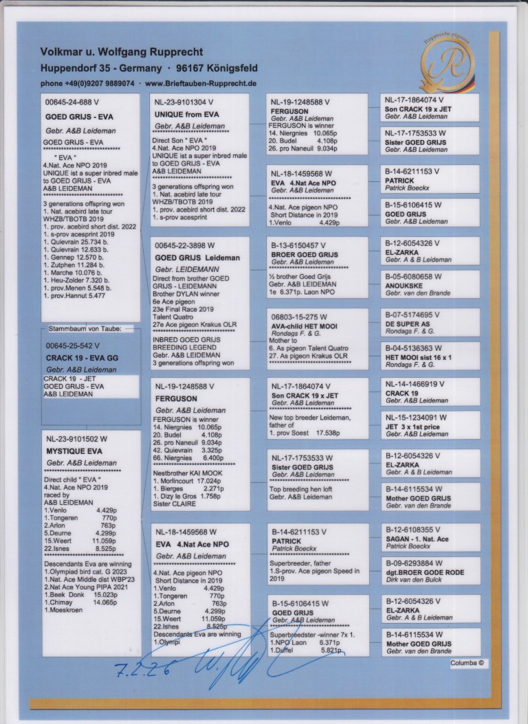Uit: ”Goed Grijs-Eva”, uit zoon ”Eva”, 4. Nat. Asduif Sprint NPO & dochter ”Goed Grijs”, 7x 1. Prijs & 1. NPO Laon 6.371 d., nazaten 7x 1. Nat. Asduif x ”Mystique Eva”, dochter ”Eva” 4. Nat. Asduif Sprint NPO & dtr. ”Goed Grijs”