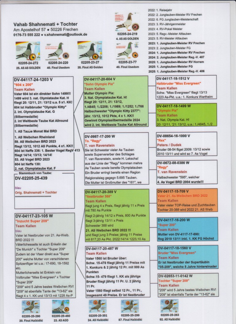 Uit: ”604 x 200”, Team Kallen, uit zoon ”Olympic Pia”, 3. Olympiade duif Cat. H x ”Inzucht Super 209”, Team Kallen, uit broer ”368”, 21. Nat. Asduif Duivinnen Duitsland, uit zoon ”Vater Asweibchen” & ”Super 200”