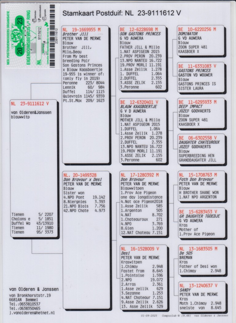 ”DE 612”, 5.-2.207 d., 5.-1.851 d., 11.-1.980 d., 43.-13.910 d., 95.-3.373 d., uit: ”Brother Jill”, broer ”Jill”, 1. Nat. Asduif 2015 x ”Don Bravour x Desi”, dochter ”Don Bravour”, 1. Prov. Asduif Dagfond, 4. Nat. Asduif Dagfond 2018