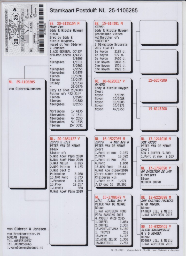 Uit: ”Moon Eye”, 1.-4.135 d., 1.-1.511 d., 4.-2.053 d., 5.-1.635 d., vader 1.-2.207 d., 4.-1.880 d., 8.-2.053 d. x ”Zorro x Jill”, zus 5. & 8. Nat. Asduif PIPA-Rankings, dochter ”Jill”, 1. Nat. Asduif, dochter ”Zorro”, 4. Nat. Asduif