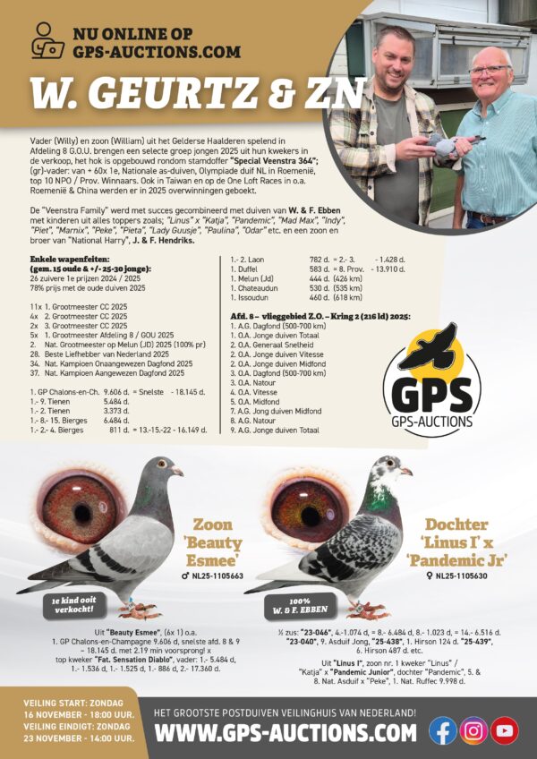 Vader (Willy) en zoon (William) uit het Gelderse Haalderen spelend in Afdeling 8 G.O.U. brengen een selecte groep jongen 2025 uit hun kwekers in de verkoop, het hok is opgebouwd rondom stamdoffer “Special Veenstra 364”; (gr)-vader: van + 60x 1e, Nationale as-duiven, Olympiade duif NL in Roemenië, top 10 NPO / Prov. Winnaars. Ook in Taiwan en op de One Loft Races in o.a. Roemenië & China werden er in 2025 overwinningen geboekt.