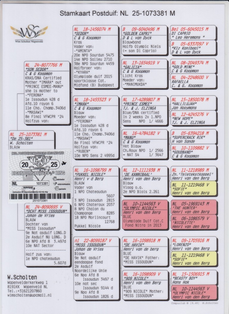 Uit: ”Son Sedor”, C. & G. Koopman, 1/2 zus ”Ferona”, 1. Issoudun 428 d., uit dochter ”Prince Esmee” & ”Manu” x ”Docht. Miss Issoudun”, Johan de Vries, 1/2 zus 1. NPO Chateaudun 5.607 d., dtr. ”Miss Issoudun”, 9. Nat. Asduif