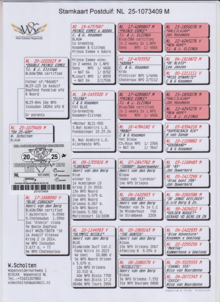 Uit: ”Double Prince Esmee”, vader ”Bouke”, 1. Prov. Noord Asduif Dagfond, uit zoon & dochter ”Prince Esmee” x ”Blue Curacao”, 7. Quiévrain 6.058 d., 9. Chateaudun 1.299 d., zus ”Alexis”, 3. Nat. Asduif Dagfond WHZB