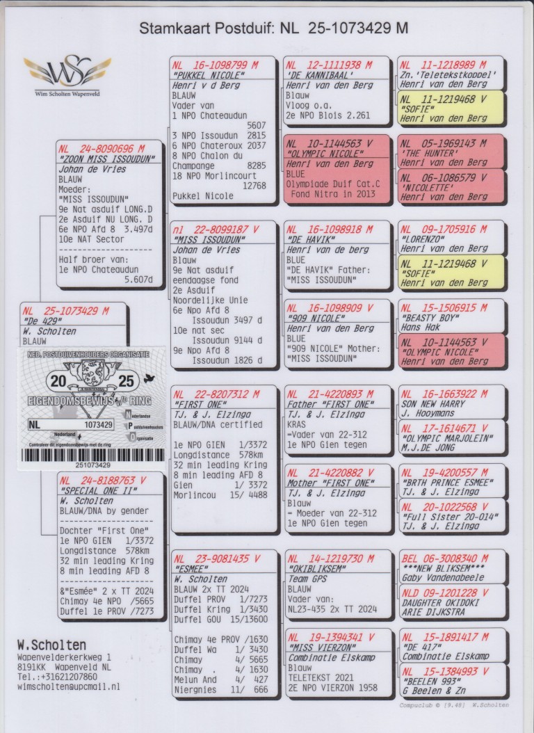 Uit: ”Zoon Miss Issoudun”, 1/2 broer 1. NPO Chateaudun, 3. NPO Issoudun, zoon ”Miss Issoudun”, 9. Nat. Asduif Dagfond x ”Special One II”, dochter ”First One”, 1. NPO Gien 3.372 d. (8 min. vooruit), 15. Morlincourt 4.488 d.