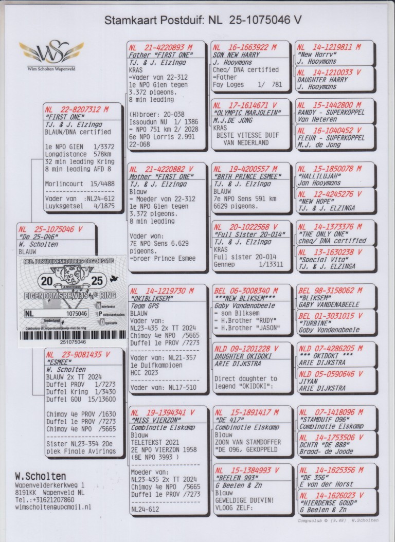 Uit: ”First One”, 1. NPO Gien 3.372 d. (8 min. vooruit), 15.-4.488 d., vader 4.-1.875 d., uit zoon ”Olympic Marjolein” x ”Esmee”, 1. Prov. Duffel 7.273 d., 4. NPO 5.665 d., 4. Prov. 1.630 d., uit zoon ”New Bliksem”