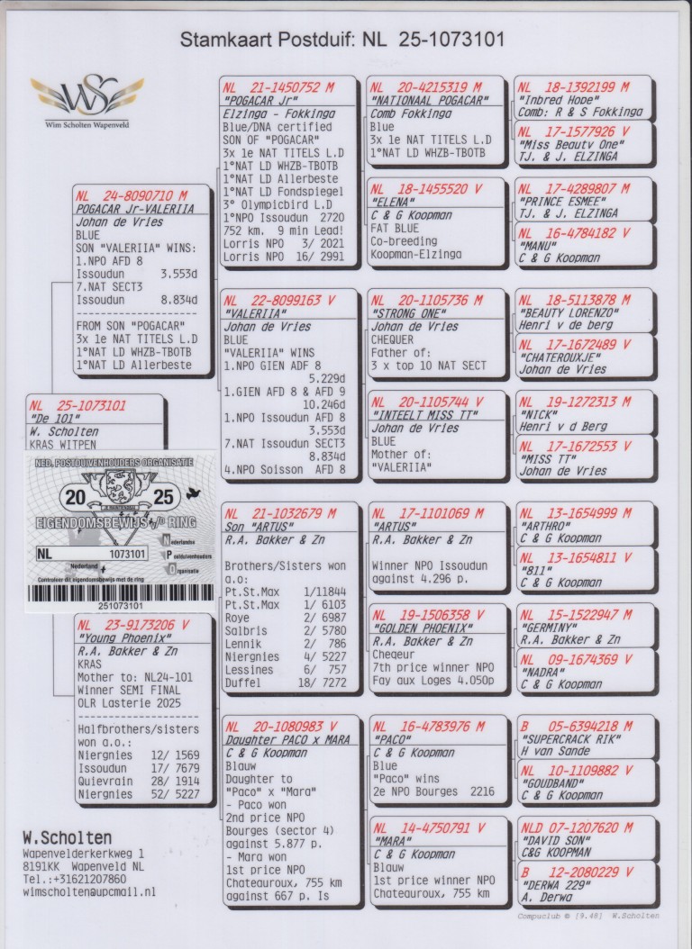 Uit: ”Pogacar Jr.-Valeriia”, zoon ”Pogacar Jr.”, Nieuwe Stamvader Johan de Vries & zoon ”Valeriia”, 2x 1. NPO x ”Young Phoenix”, moeder 1. Halve Finale OLR Lasterie Spanje 2025, uit zoon ”Artus” & ”Golden Phoenix”